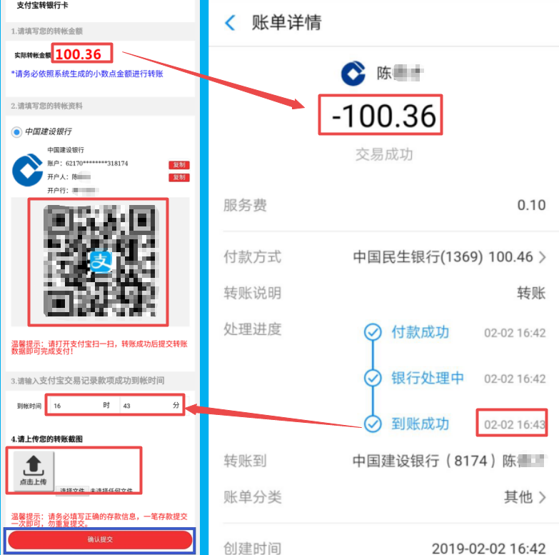 第四步:当您的支付宝款项到达公司收款账号内时,您的支付宝账单详情会显示到账成功,您在登陆平台提交下您的存款数据,财务人员在查收到您的款项,核对您的存款数据无误后,会在3分钟内为您添加额度,刷新页面即可查收。